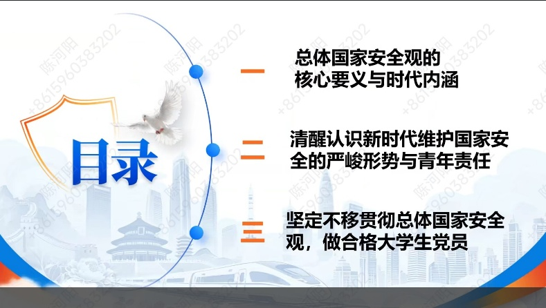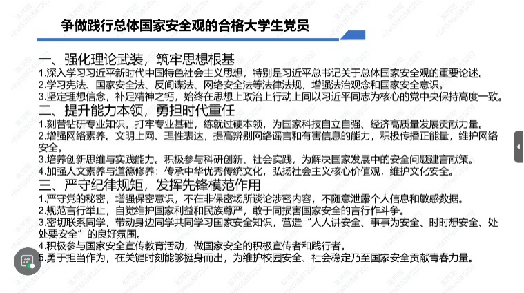 国家安全无小事,青年担当正当时。本次党课不仅深化了同学们对总体国家安全观的认知,更激发了大家将个人成长融入国家发展的责任感。作为新时代青年,唯有把国家安全意识内化于心、外化于行,以理想信念为帆、以实干担当为桨,方能在民族复兴的征程中,以青春之我守护安全之中国,以奋斗之姿书写合格党员的时代答卷。