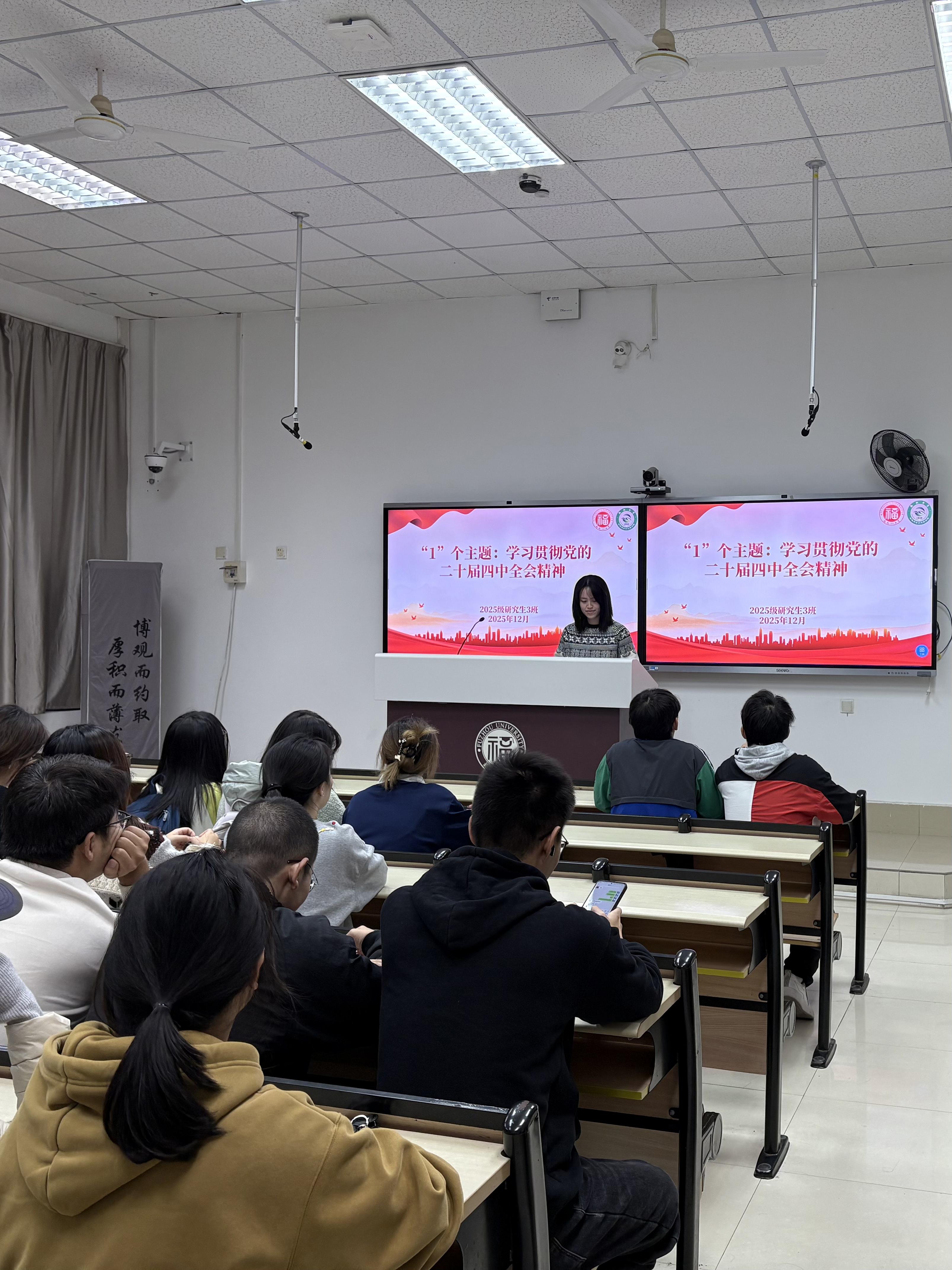 为深入学习贯彻党的二十届四中全会精神,进一步提升同学们的思想政治素养,坚定理想信念、强化使命担当,环境与安全工程学院2025级研究生3班于2025年12月10日组织开展了主题教育班会。本次班会以学习党的二十届四中全会精神为核心,并结合交通安全、防艾宣传、心理健康等教育内容,统一思想、凝聚共识,取得良好效果。
