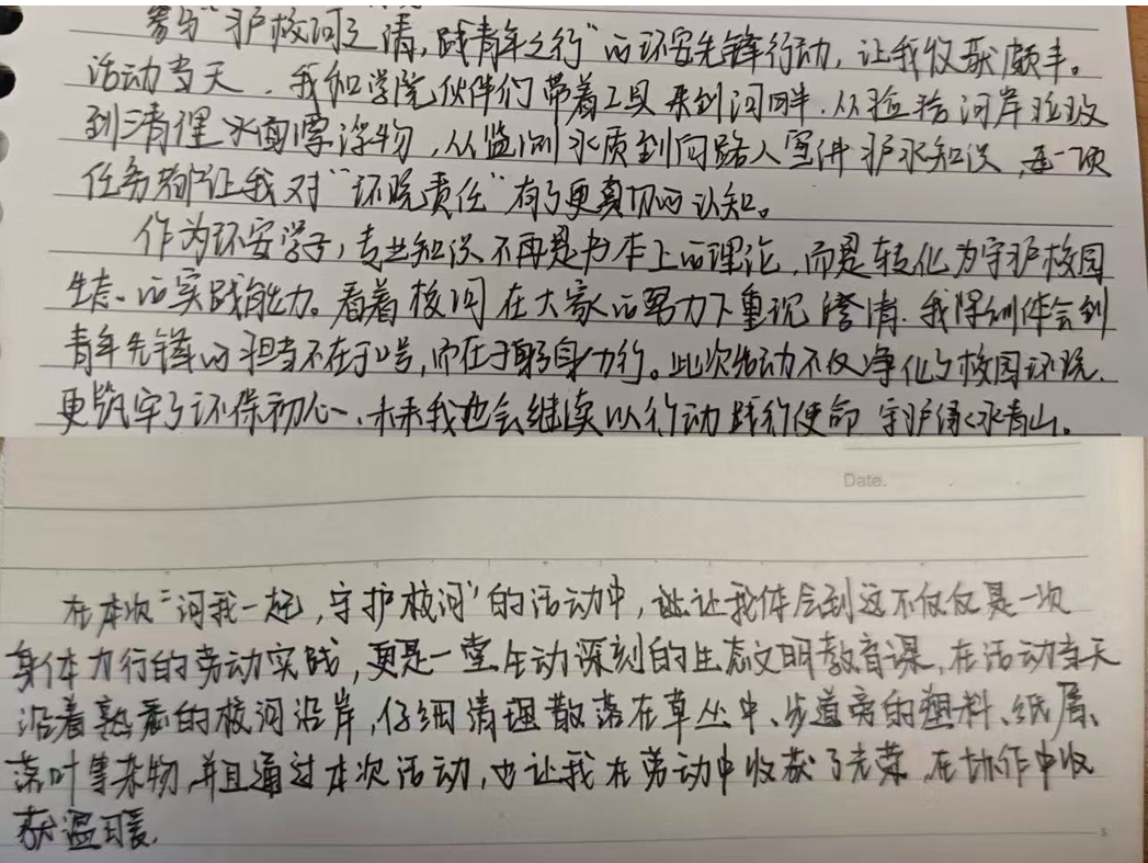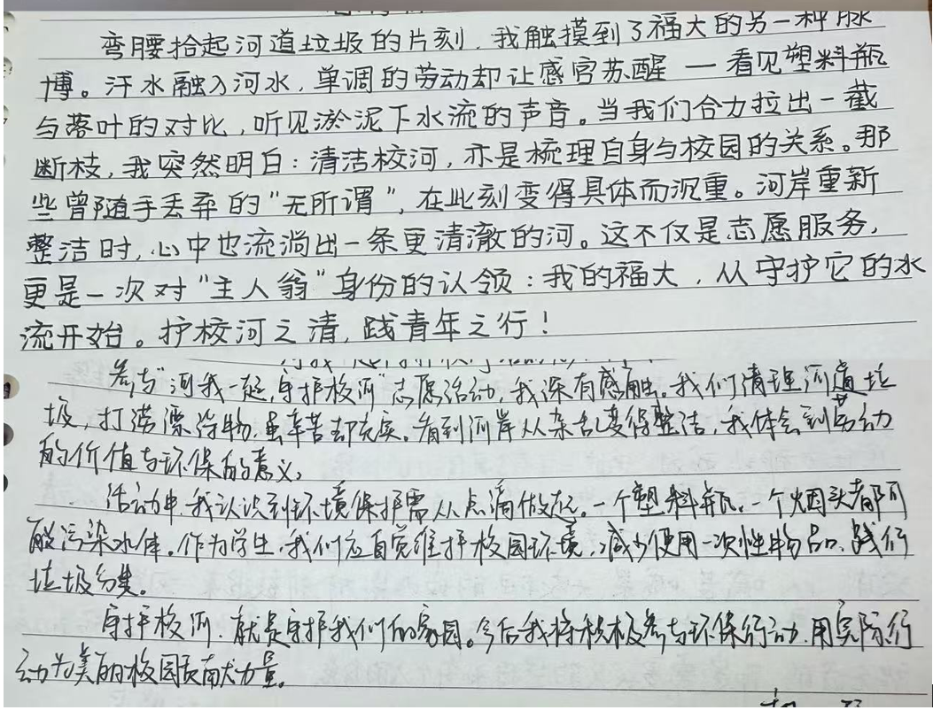 2025年12月9日,支部成员走进福州大学旗山校区校河沿岸,开展“河我一起,守护校河”主题实践。活动现场,团员清理散落在校河、草丛、步道旁的塑料瓶、包装袋及落叶,在多元协同的实践中深化对生态文明建设的责任感与使命感。活动结束后,成员们写下自己的心得体会,其中团员江紫星写道: “以前觉得环保是‘大事’,今天弯腰捡起第5个垃圾时,突然明白每一次弯腰都是对制度要求的回应。”