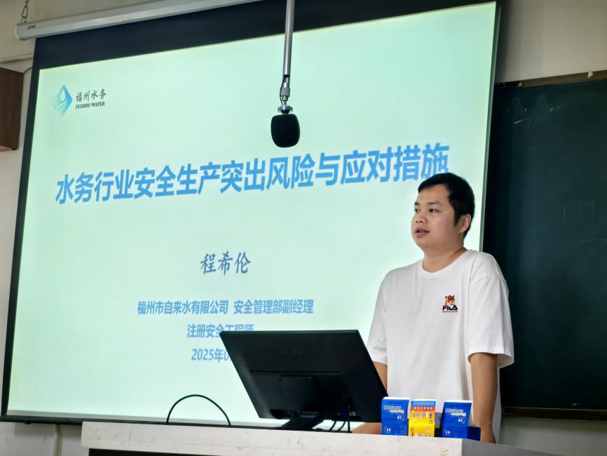 安全工程专业的会场气氛严谨而热烈,学院2016届安全工程专业本科生、2019届安全科学与工程专业硕士研究生、现任福州市自来水有限公司安全管理部副经理的程希伦校友通过一系列真实的工程案例,为新生们带来了一堂生动的专业课。他从福州水务安全生产现状概况、安全生产突出风险和主要应对措施三个方面深刻阐述了安全工程在国民经济各领域不可或缺的重要性,勉励同学们要锤炼严谨细致、敬畏生命的职业品格。