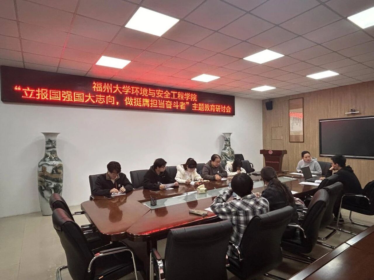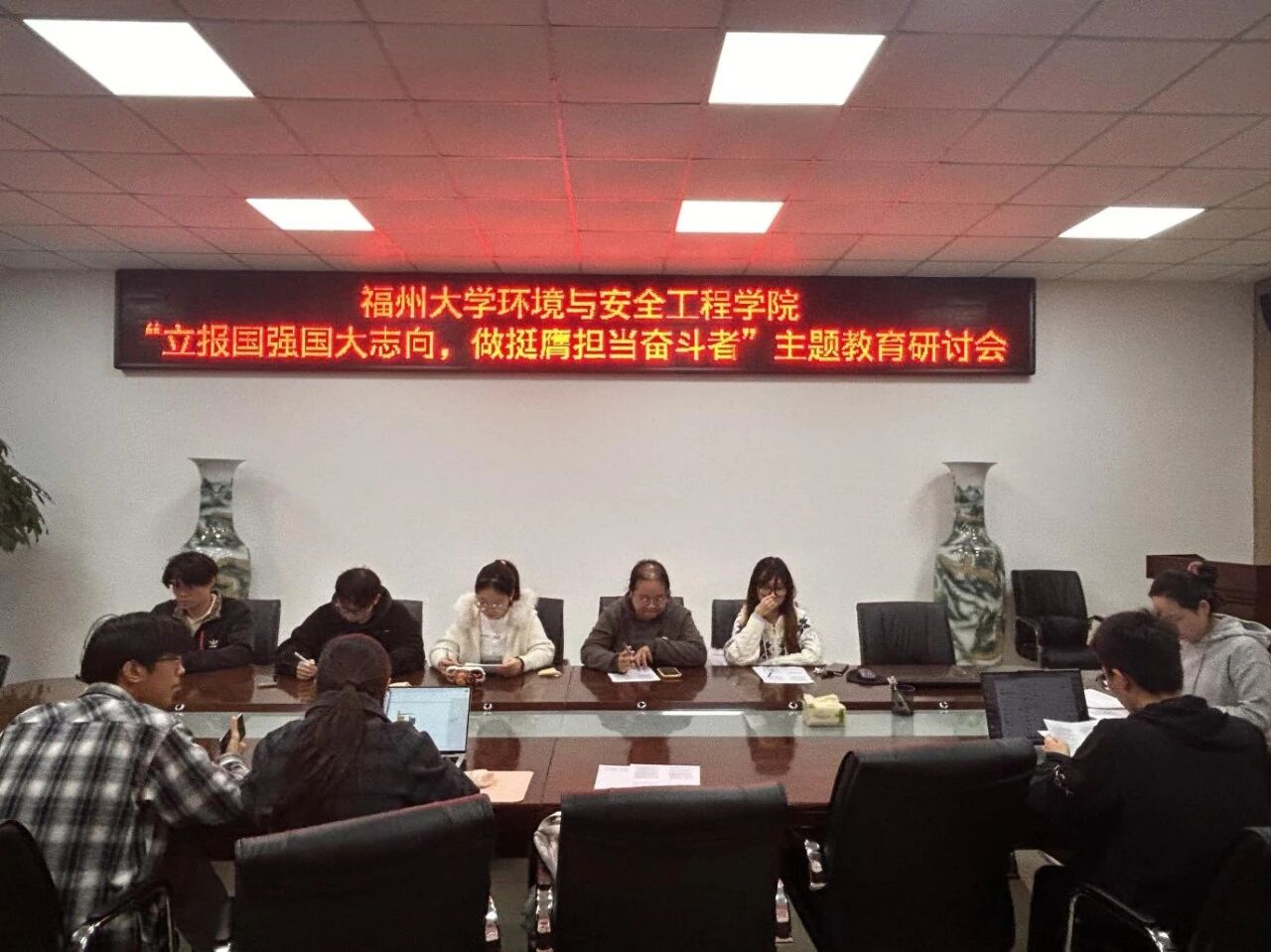 青春逢盛世,奋斗正当时。为引导青年学子将个人理想融入国家发展大局,树立报国强国的远大志向,福州大学环境与安全工程学院“立报国强国大志向,做挺膺担当奋斗者”主题教育研讨会在嘉锡楼314顺利召开。环境与安全工程学院学院团委副书记廖烨檬老师担任主讲人,本研主席团全体学生齐聚一堂,共话青春担当,共绘奋斗蓝图。