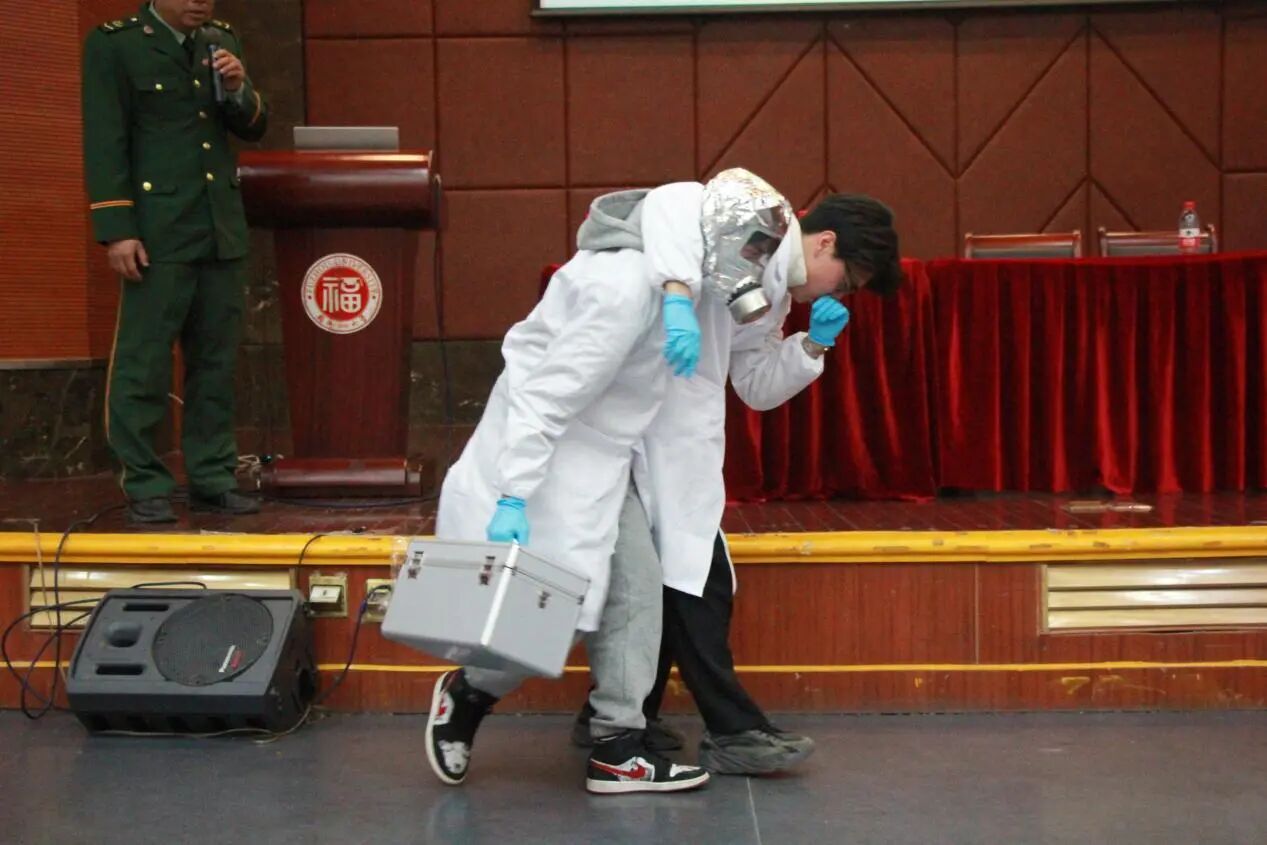 实操演练环节实操演练环节是本次活动的核心,在实验中心、保卫部的统筹协调与林鸿芬教官的专业指导下,分“应急疏散、油盆灭火、危险化学品中毒事故处置”三个场景有序推进: