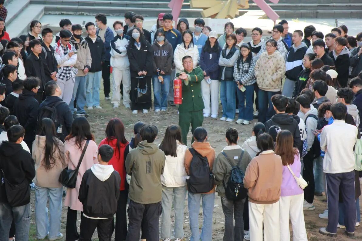 1应急疏散演练:模拟实验楼突发火情,浓烟警报响起后,参演师生在工作人员引导下,迅速弯腰捂鼻、沿墙壁避开明火区域,按照预设疏散路线快速撤离至第一学科群化学实验楼北侧广场安全区域,全程仅用时3分钟,展现出高效的应急反应与协作能力。 2油盆灭火演练:林鸿芬教官现场演示手提式干粉灭火器“提、拔、握、压”四步标准操作法,着重强调“对准火焰根部、保持3-5米安全距离”的关键要点,针对师生实操中的问题及时纠正指导。师生分组上前实操,均成功扑灭模拟油火,熟练掌握初期火灾扑救技能。3危险化学品中毒事故应急演练:本次演练以“氨气泄漏致人员中毒”为模拟场景(事故假定:2025年11月20日15:15,实验室实验期间容器气体泄漏,两名实验人员出现不同程度中毒症状),处置流程规范有序:首先由现场人员立即关闭气体阀门、打开实验室窗户通风,快速切断危险源;随后开展分级救护——针对轻危患者,救护队员及时询问身体状况,引导其转移至通风处并给予新鲜空气(氧气);全过程严格遵循“先控源、再救急、分轻重”的原则,充分验证了学院危化品中毒应急方案的可行性与实操性。