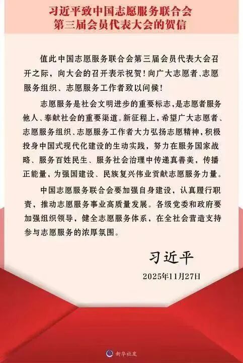 习近平致信中国志愿服务联合会第三届会员代表大会
