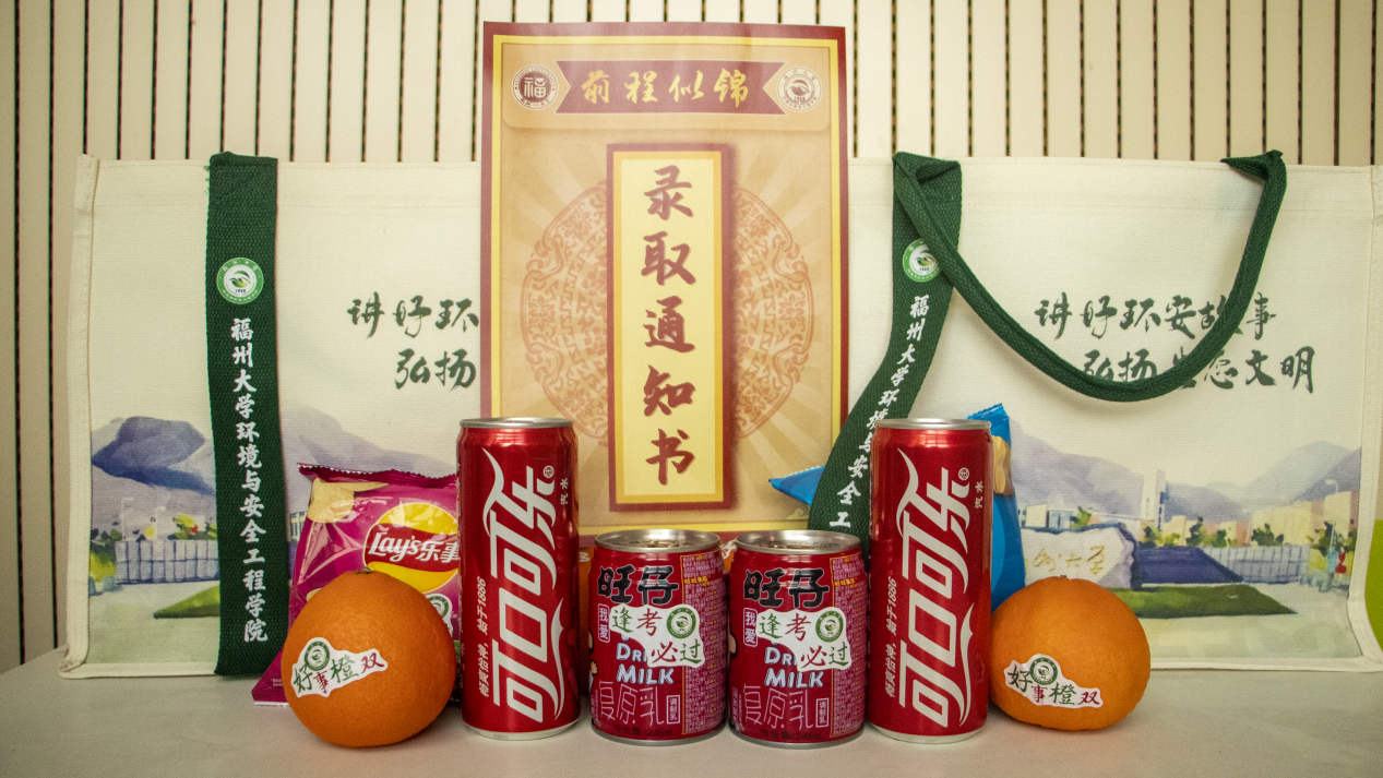 考研加油包内有考研必胜文具袋、考研能量包(旺仔牛奶、可口可乐、早餐面包等)。每一份礼品都包含学院对环安考研学子的浓浓关怀和期盼。在给同学们送上考研祝福的同时,刘朝晖副书记也向同学们介绍了考研加油包的寓意。帆布袋上“金榜题名”和“一举夺魁“等字样,以及袋内“好事‘橙’双”和“逢考必过”等贴纸是学院对各位学子满满的祝福。
