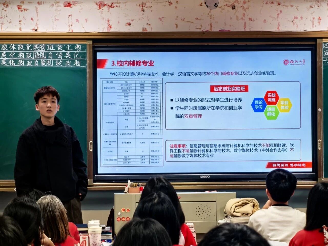 宣讲中,宣讲队员通过PPT和宣传海报,向学弟学妹们生动介绍了福州大学的校园风光、学科优势、师资力量及丰富的校园生活,详细解读了近年招生概况与高校专项计划的报考条件、专业范围及政策优势,为有意向报考福大的同学提供了精准指导。宣讲队员还为大家分发了福大周边文创和小零食,现场氛围轻松热烈,学弟学妹们积极互动、踊跃提问,对大学生活充满向往。