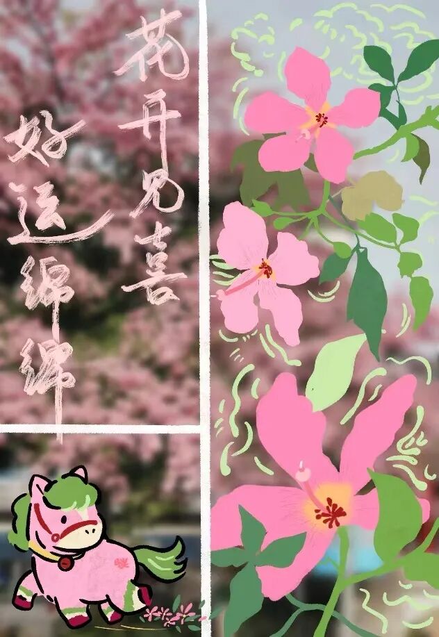 粉花缀枝,瑞马踏春,一半是春日盛景,一半是新年期许。樱花的柔粉撞入眼底,灵动的小马携好运而来,花开见喜是愿景,好运绵绵是祝福。在这个充满生机的马年,愿你如这绽放的繁花,在专业领域里肆意生长;如这踏春的瑞马,奔赴前程时步履不停,所遇皆喜,所行皆顺。