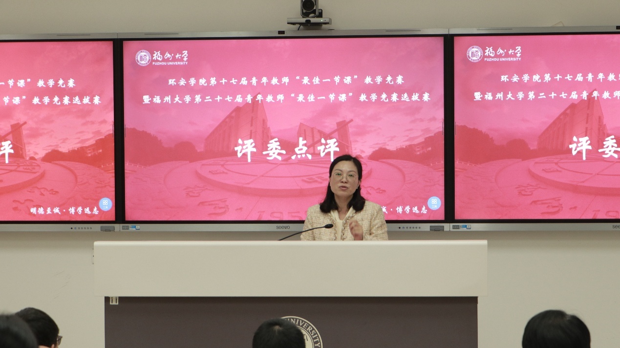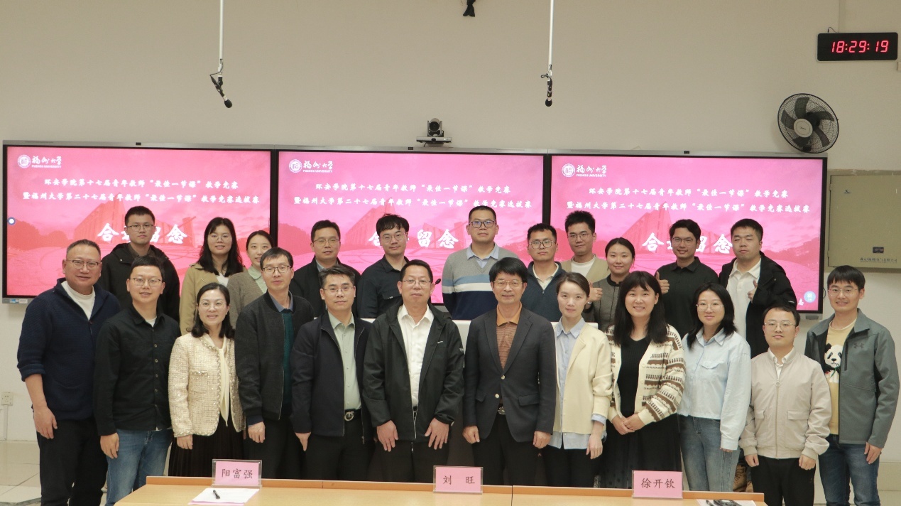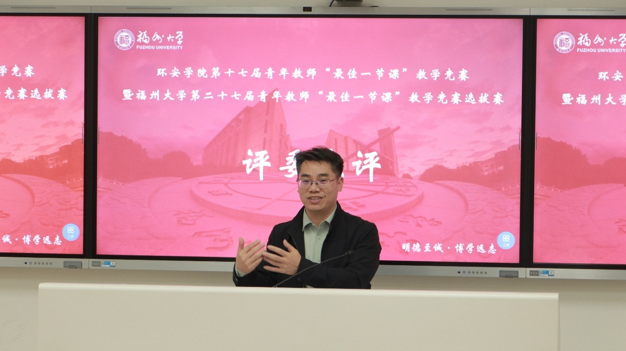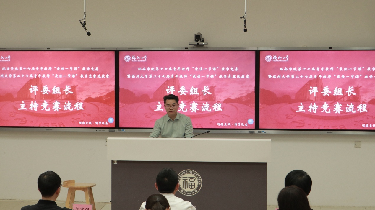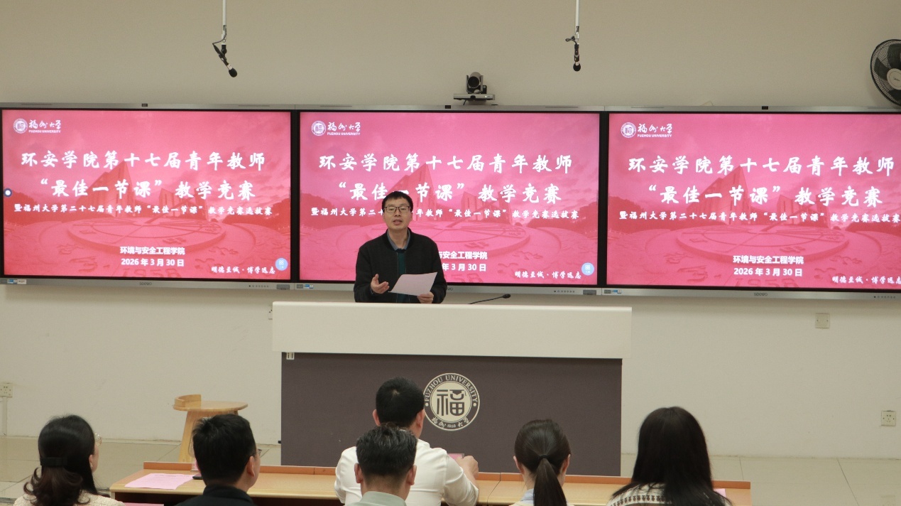 春和景明,教泽绵长。为深入贯彻立德树人根本任务,搭建青年教师教学交流平台,锤炼教学基本功,提升课堂教学质量,3月30日下午,环境与安全工程学院第十七届青年教师“最佳一节课”教学竞赛暨福州大学第二十七届青年教师“最佳一节课”竞赛选拔赛在旗山校区西2-101教室顺利举行。环境与安全工程学院党委书记刘旺研究员、执行院长徐开钦教授、副院长阳富强教授、环境与安全工程学院工会主席潘文斌教授、紫金地质与矿业学院副院长胡建华教授、经济与管理学院副院长梁红艳教授、化工学院孙志新副教授、材料科学与工程学院吴啸副教授、环境与安全工程学院温小乐副教授、院长助理邹亚锋校聘教授、13名参赛教师以及学院部分师生参与本次活动。