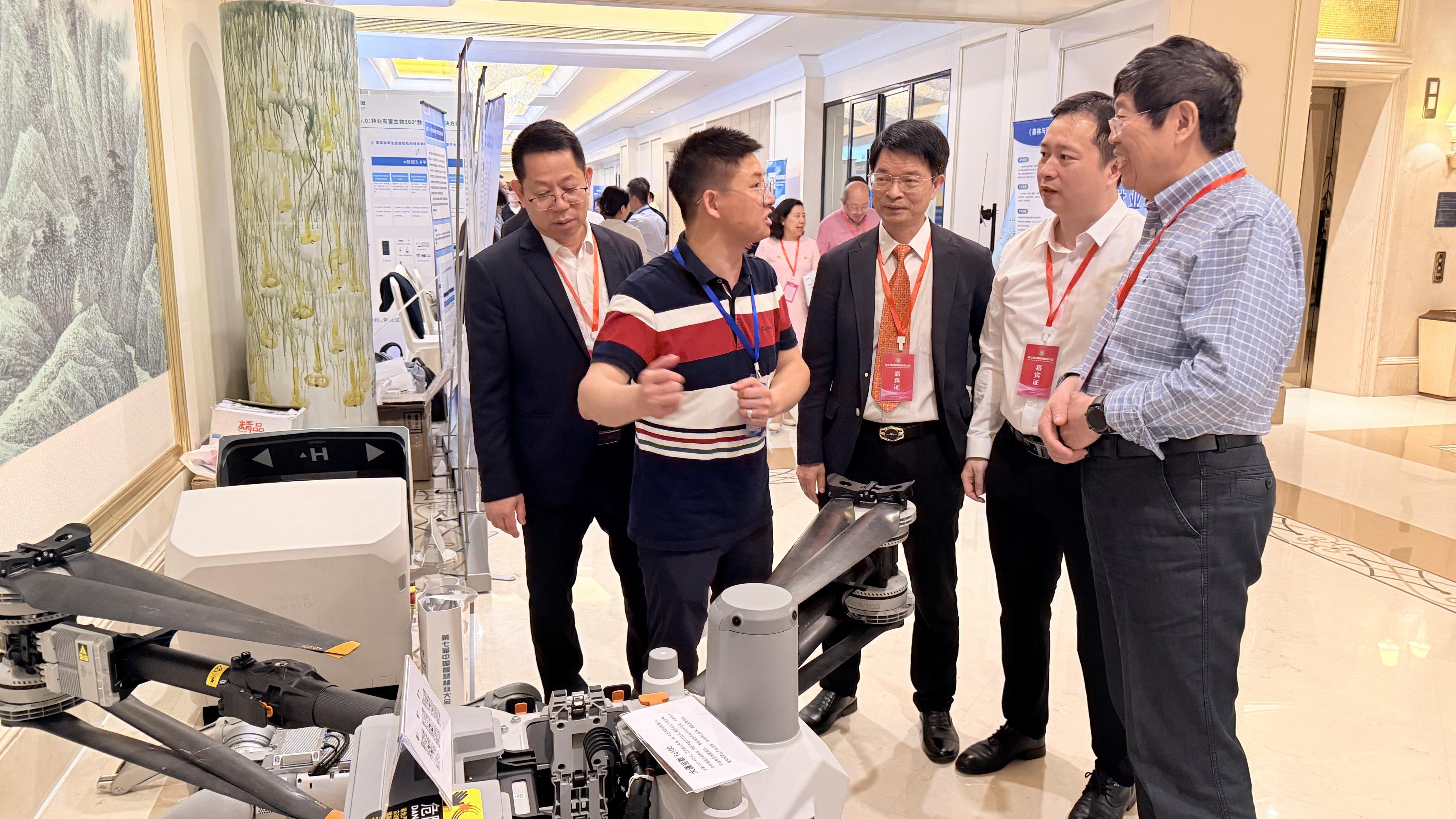 会议期间,张亚雷副校长前往智慧林业成果展区,实地察看环境与安全工程学院科研团队关于竹林重大病虫害遥感监测预警技术在企业落地应用的实施成果。