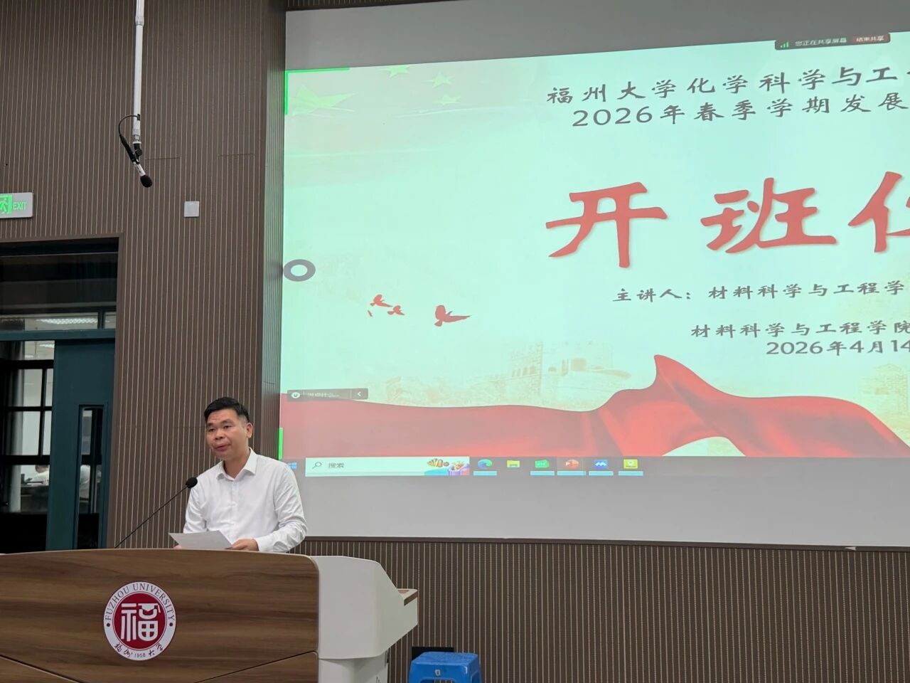 为强化理想信念教育,引导学员以党员标准严格要求自己,4月14日晚,福州大学化学科学与工程学部2026年春季学期发展对象培训班(总第十一期)材料学院党委党校2026年春季发展对象培训班开班仪式暨第一讲在东2-100教室顺利举行。仪式由材料学院团委副书记张庭士老师主持,学院党委副书记沈庆斌出席,全体培训学员参加。