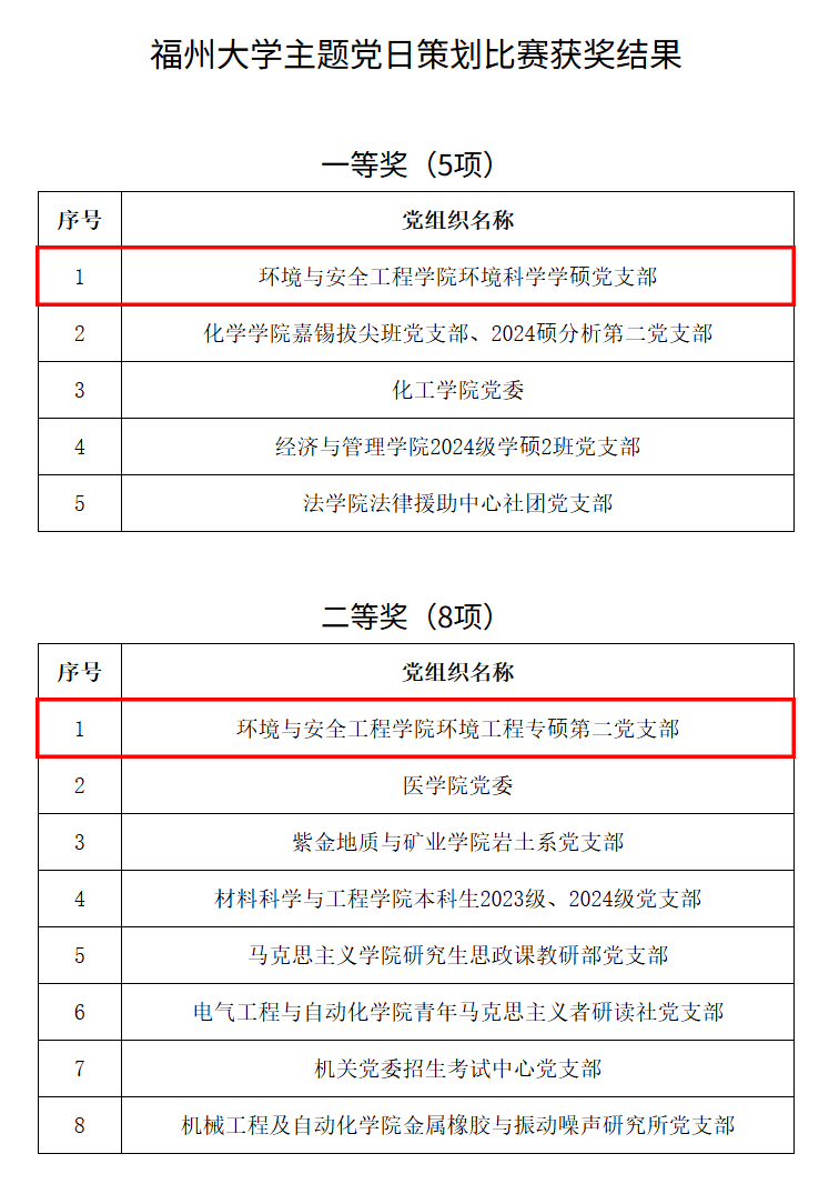 在福州大学党委组织部主办的主题党日策划比赛中,经各二级党委申报推荐、校外专家专业评审等环节,我院选送的环境科学学硕党支部与环境工程专硕第二党支部策划在比赛中分别荣获一等奖(排名第一)和二等奖(排名第一)的佳绩。