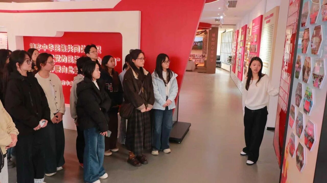 活动现场,讲解员带领学院学子依次参观了三爱读书社、党建区、铸牢区、民族团结进步故事墙、文化融合区、石榴籽公园等区域,全方位介绍了工作室的建设历程、工作成效与特色亮点。