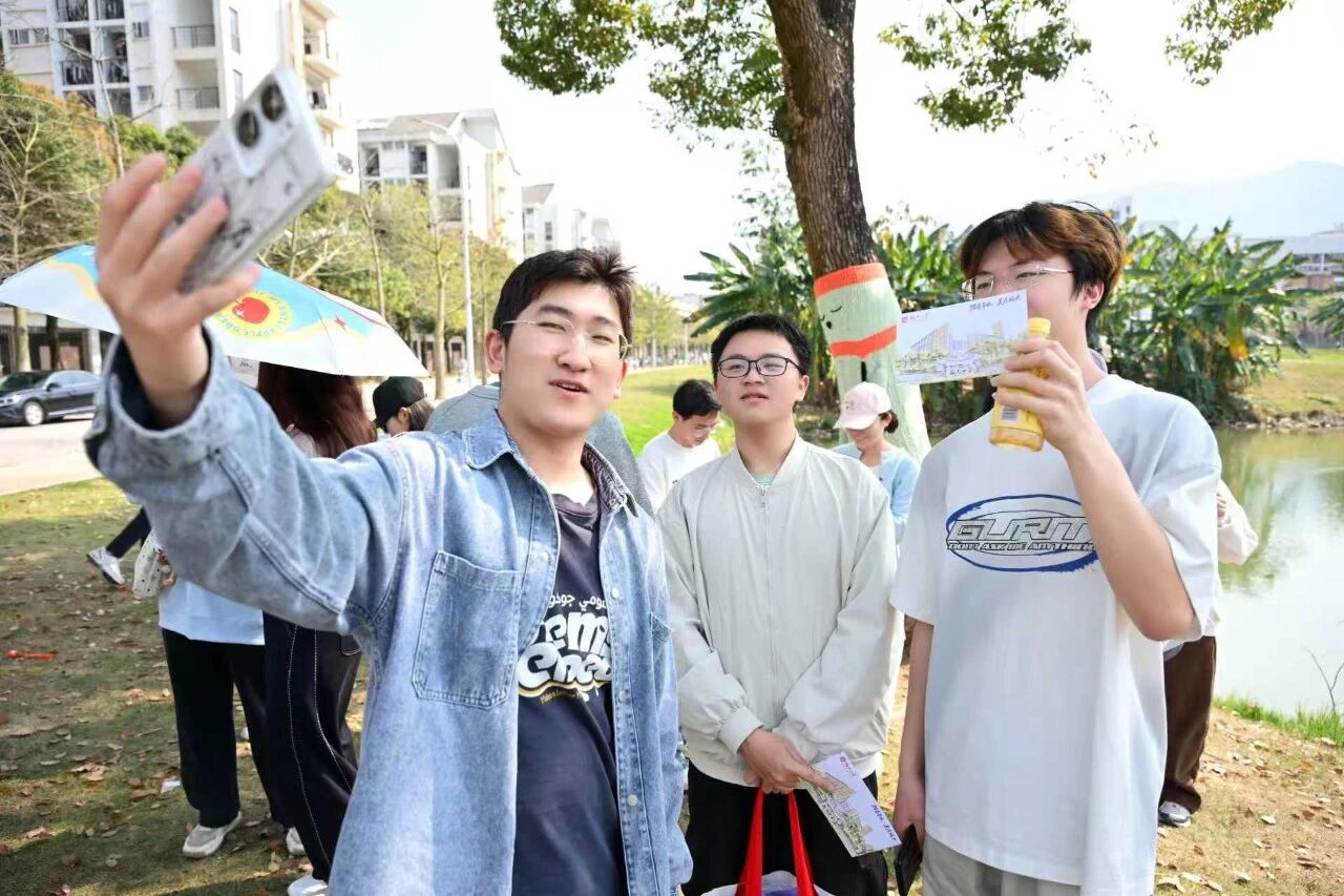 活动伊始,参赛选手们在青春广场集合,沿“青春广场-望舒湖-致知湖-思勤湖-翠微湖-李冰父子雕像-青春广场”路线行走,途经校园各水域打卡点,参与选手们手持活动任务卡完成每个点位指定任务后,由工作人员在任务卡盖章,集齐4个点位认证后返回终点,即可兑换纪念品并参与抽奖,全程融合 “健步+寻宝 + 生态体验”,兼具趣味性与教育性。