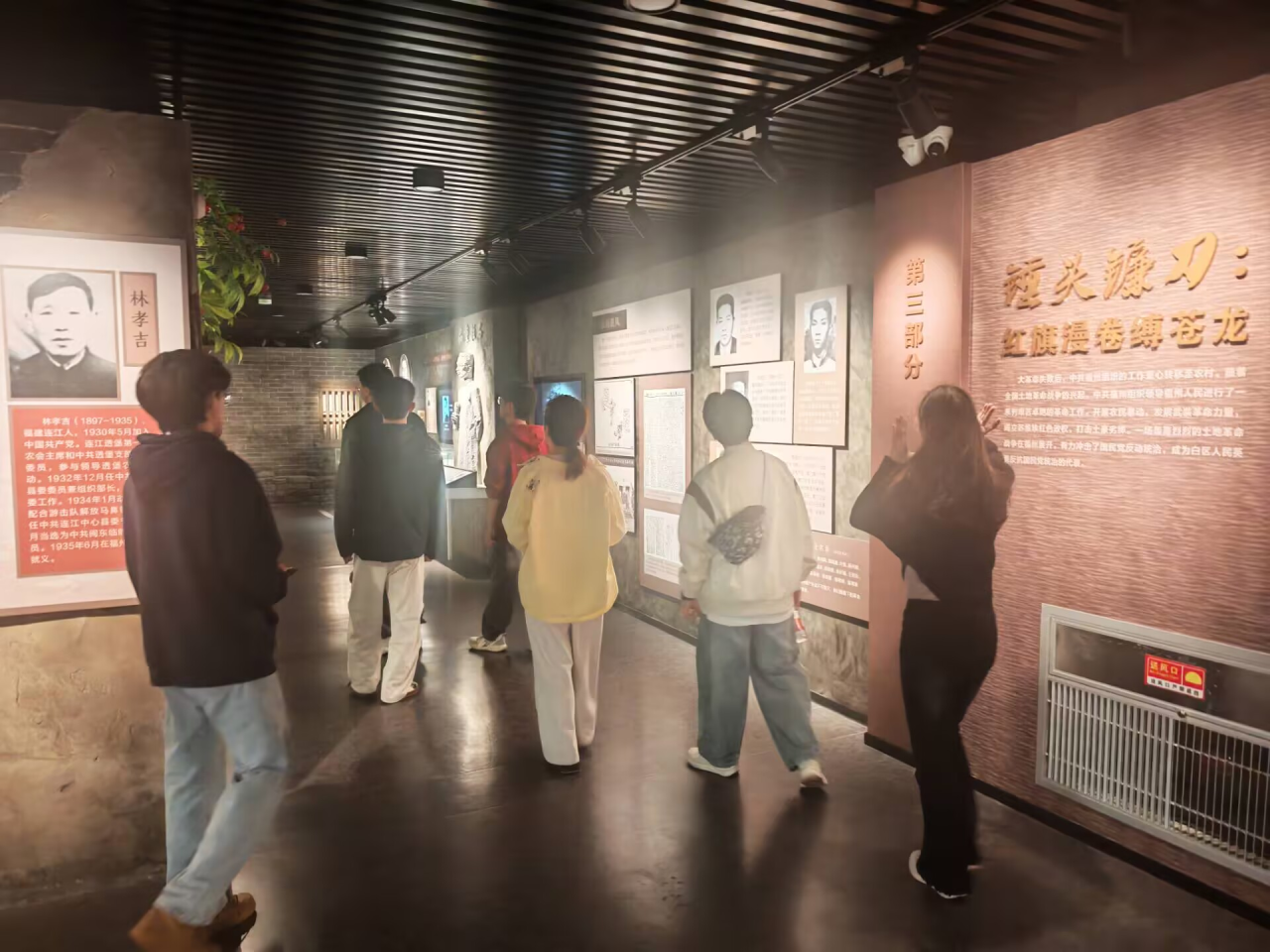 在“锤头镰刀:红旗漫卷缚苍龙”展区,同学们看到了一代代福州共产党人的奋斗足迹。从罗石冰、杨峻德到曾一贯、黄孝敏,历任福州市委书记的事迹展板前,大家久久驻足。这些革命先辈大多正值青春年华,平均年龄不过三十岁,却在白色恐怖的笼罩下,以笔为枪、以身为炬,深入农村领导土地革命,组织武装斗争,用青春和生命践行着对党的誓言。展区内的 “刑场上的婚礼” 雕塑,让同学们印象尤为深刻:戴着手铐脚镣的革命先辈昂首挺胸,荔枝树的浓荫下,他们的目光坚定而炽热,即便面对死亡,也紧紧相依、坚守信仰,让大家真切体会到 “生命诚可贵,爱情价更高,若为自由故,二者皆可抛” 的壮烈情怀。展区里,“不拿群众一针一线” 的场景复原、“千心万眼盼红军” 的群众期盼画面,更生动诠释了党与人民的鱼水深情 —— 正是这份血肉联系,让革命力量在艰难困苦中不断发展壮大。